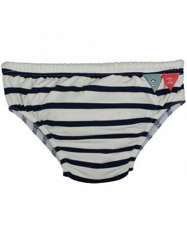 Elaborée en rayures marine et blanc, tissu microfibre, confortable à porter, avec liens pour resserrer la taille et motif Sophie la Girafe® au dos, douce au toucher, sèche vite, elle est doublée d'une pellicule plastifiée, et d’un molleton pour être absorbante et éviter ainsi les petits ennuis de fuite ; recommandée en piscine.